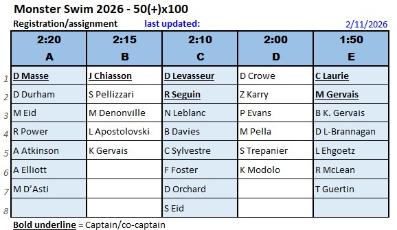 (Tentative: depending on registration, structure and send-off times can be modified as we get closer. Also depends how many lanes we successfully secure the day of the swim – prepare to be flexible).