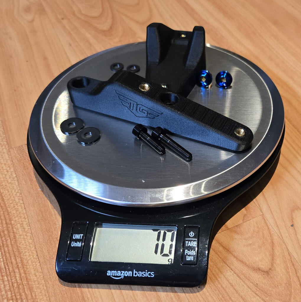 Nice and light at ~70g in the ‘final version’ with 4 titanium screws (everything except the carbon cage):