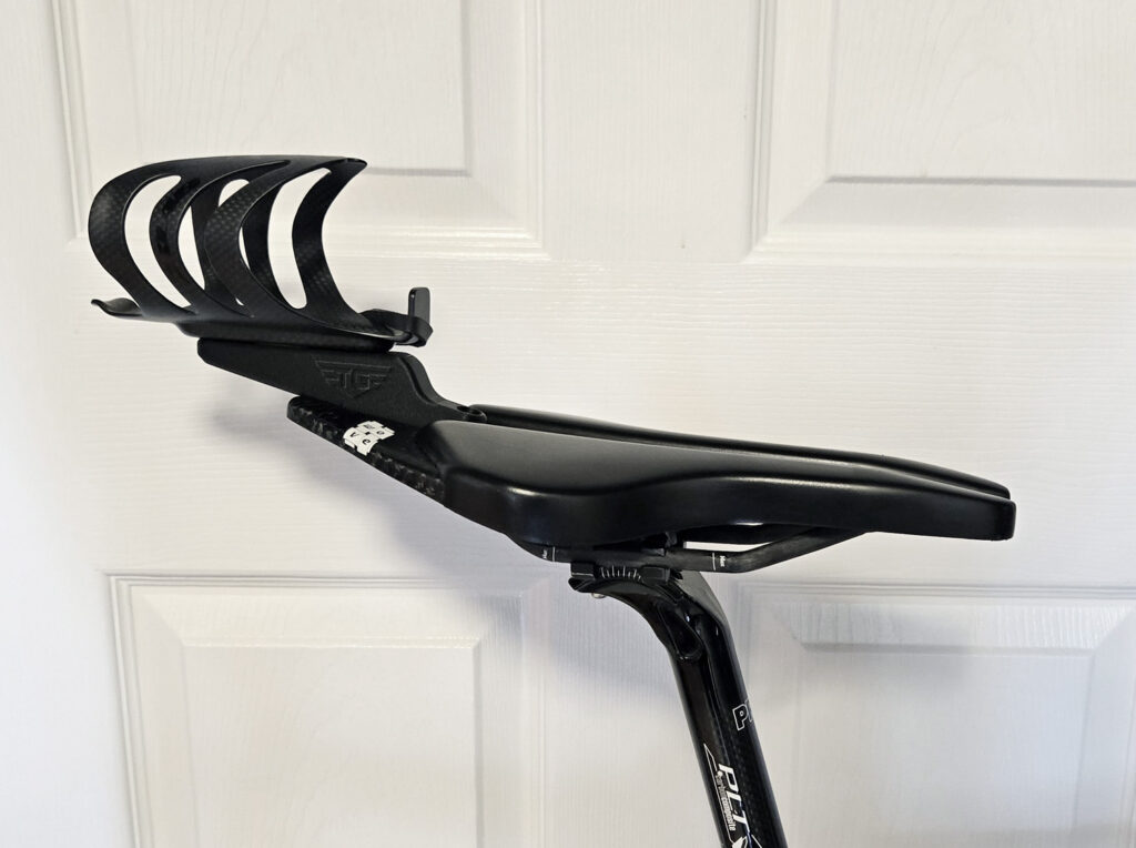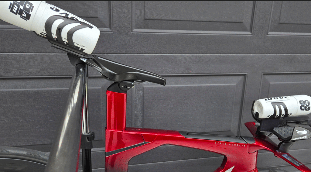 If not familiar with the “transition hook” bracket, it solves the issue of racking triathlon bikes in transition. When bottles are above the saddle it increases the height and makes it difficult or impossible to slide the bike under the horizontal bar of the rack to hang it by the nose of the saddle.